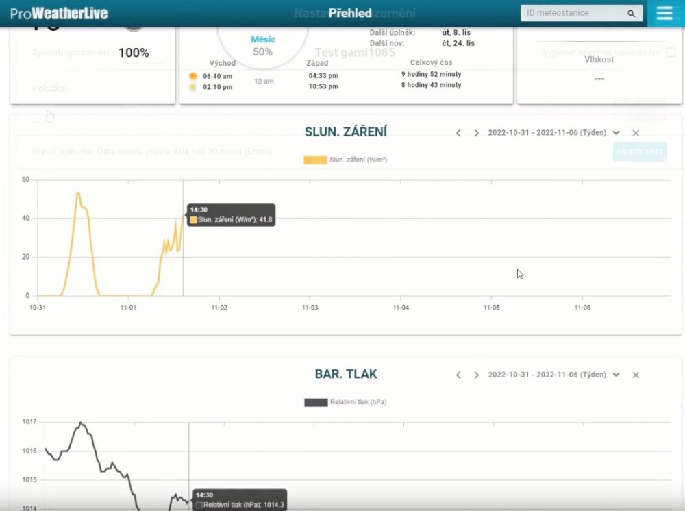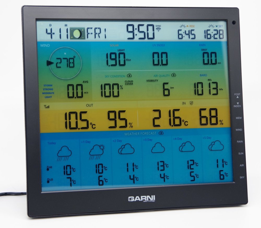 METEO blog Recenze Recenze - GARNI 1085 Arcus - meteostanice, která se bude líbit každému Recenze - GARNI 1085 Arcus - meteostanice, která se bude líbit každému 02. 09. 2025 Značka Garni Technology je v roce 2022 neobvykle aktivní, neboť na náš trh uvádí další, v tomto roce již třetí, poloprofesionální meteostanici řady Arcus. Po modelech 3055, 3015 jde tentokrát o model 1085 a opět s přívlastkem Wi-fi. Avšak pozor tentokrát je přívlastek delší, neboť z kompletního názvu stanice by mělo být všem jasné, že stanice má jednu unikátní funkci - zobrazení 6denní předpovědi počasí. Pokud máte raději video recenze, pak klikněte pro přehrání níže: Trochu se musím pozastavit nad číselným označením stanic značky. Zatím mne nenapadá moc logiky v označení jednotlivých stanic, tedy pokud nás výrobce nechce procvičovat v ukládání různých číselných kombinací do naší paměti. Každopádně jednu závislost v numerickém označení lze vypozorovat - čím vyšší číslo stanice má, tím hlouběji budete muset šáhnout do peněženky - toto pravidlo se dá aktuálně uplatnit s vyjímkou jednoho modelu na každou poloprofesionální meteostanici značky Garni Technology. Zpět však k novince, která má dle mého názoru poměrně slušný potenciál, alespoň po krátkém několikadenním seznámení, kdy jsem měl tu možnost stanici vyzkoušet. Nejprve tedy pár stručných slov o stanici. GARNI 1085 Arcus se skládá ze základny (přijímače) s poměrně velkým displejem s barevným pozadím o rozměrech 191 x 163 mm. Základnu lze zavěsit, ale i postavit na podložku díky dvěma výklopným nožičkám. V základně jsou integrovány senzory teploty, vlhkosti a atmosférického tlaku. Další senzory se již nachází v integrované sadě senzorů (ISS), které má označení GARNI 7INT a měří teplotu, vlhkost, rychlost a směr větru, dešťové srážky, UV index a sluneční záření. ISS komunikuje se základnou bezdrátově (868 MHz) a to až na vzdálenost 150 m (v otevřeném prostoru). Integrované čidlo 7v1 je jiné konstrukce než poslední model značky (GARNI 3015 Arcus) a není vybaveno vestavěným ventilátorem. Pokud jde o napájení, tak základnu je třeba mít zapojenou v el. síti. Pro případ výpadku napájení z el. sítě slouží baterie CR2032, ale ta je zde pouze jako záloha aktuálního času/data nebo uložených minim/maxim. ISS je pak napájena pomocí 3 kusů nabíjecích baterií 3,6V Ni-MH / 2000 mAh (součástí dodávky), které jsou dobíjeny ze solárního panelu umístěného na ISS. Teoreticky tedy nebude nutné vyměňovat baterie, ale z praxe víme, že i dobíjecí baterie bude jednou potřebovat výměnu a je otázkou, zda-li není v tomto případě (dle technické specifikace senzor vydrží na jedno nabití v provozu až 394 dní) lepší volbou, pokud je vysílač napájený z klasických baterií, případně kombinace dobíjecí baterie + záložní klasická jako je tomu např. u integrovaného bezdrátového čidlo GARNI 095HA (GARNI 3055 Arcus). Co do počtu senzorů je stanice tedy vybavena bohatě, viz zmíněné integrované čidlo 7v1. Pokud by to ale někomu nestačilo, ke stanici lze přikoupit hned několik dalších bezdrátových senzorů: až 7 čidel pro měření teploty a relativní vlhkosti GARNI 055H až 7 čidel pro měření teploty a relativní vlhkosti GARNI 056H s displejem až 7 čidel pro měření vlhkosti a teploty půdy GARNI 071S až 7 čidel pro měření teploty vody v bazénu GARNI 057P 1 čidlo detekce blesků GARNI 072L až 4 čidla pro měření vnitřní kvality vzduchu GARNI 104Q Za široké možnosti rozšíření musím výrobce jednoznačně pochválit. A i když se určitě najdou jedinci, kteří by chtěli více (zrovna nedávno k nám do prodejny přišel zákazník, který hledal meteostanici, u které by přijímač uměl komunikovat až s 3 větroměry), myslím si, že 99,9 % potenciálních zájemců bude plně uspokojeno. Se stanicí jsme se tedy již krátce seznámili, takže nyní se podívejme detailněji na jednotlivé funkce. Začneme LCD displejem, u kterého je možné nastavit kontrast displeje (dvě možnosti v závislosti na tom, zda-li je základna zavěšena či postavena na podložce) a intenzitu podsvícení. Podsvícení je možné mít i plně automatické, neboť na přední straně je světločivný senzor. Pokud byste plánovali umístit základnu do ložnice, tak mějte na paměti, že podsvícení bohužel nelze zcela vypnout. Základní funkce se ovládají pomocí 8 tlačítek na boku zadní strany. Popisky jsou přístupné z přední strany, takže není nutné stanici otáčet ani sundavat ze stěny. Pro méně častější úkony slouží dalších 7 tlačítek a 2 přepínače umístěné uprostřed zadní strany (u těchto tlačítek už bude třeba stanici otočit). Celý displej téměř čtvercového formátu je velmi přehledně rozdělený do 11 segmentů. V horním řádku se nachází kalendářní a časové údaje včetně času východu a západu Slunce či Měsíce. Nechybí tady ani fáze měsíce. Na druhém a třetím řádku úplně vlevo najdeme informace o aktuální rychlosti a směru větru. Plné čárky po obvodu kruhu (může jich být až 6) pak označují různé směry větru za posledních 5 minut. Aktualizace těchto údajů stejně jako UV indexu a intenzity solárního záření (další hodnoty na druhém řádku) probíhá každých 12 sekund. Pro úplnost dodávám, že ostatní údaje (teplota, vlhkost, srážky) se aktualizují každých 24 sekund. Segment intenzity solárního záření lze přepnout na zobrazení rizikového času expozice, což je časový údaj, který nás informuje o tom, do jaké míry je možné pobývat na sluníčku s běžným typem pokožky a bez případných následků pro naši pokožku. Poslední údaj na dru