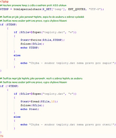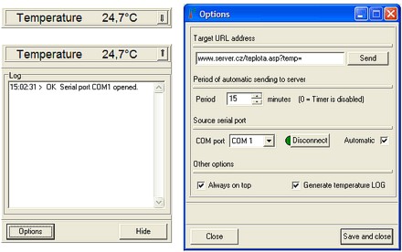 METEO blog METEO poradna - Zobrazení meteo údajů na webových stránkách METEO poradna - Zobrazení meteo údajů na webových stránkách 19. 09. 2025 Chcete měřit teplotu či jiné meteo údaje a zpřístupnit je návštěvníkům vašich internetových stránek? Pak je přesně pro Vás určen tento článek. Nejdříve je nutné si určit, které údaje chcete na svém webu zobrazovat. Teplota - do této kategorie spadají přístroje s označením TM, TMU, TME. Teplota a vlhkost - zařízení, které měří teplotu, vlhkost, rosný bod, a jenž je připojitelné k PC, nese označení TH2E. Teplota, vlhkost a atmosférický tlak - v úvahu zde připadá např. prostorový teploměr, vlhkoměr a barometr s displejem a připojením na ethernet T7510, ale většina uživatelů asi bude volit nějakou poloprofi meteostanici či rovnou o kategoii výše, značku DAVIS. Tyto stanice mají buď vlastní program, který zvládá odesílání meteodat na internet nebo spolupracují s jinými programy, které toto umožňují. Popis práce v těchto programech a jejich nastavení tak, aby uživatel mohl zasílat meteo data na internet, bude obsahem budoucích článků na METEOshop.cz. Web s podporou PHP Co je třeba pro toto řešení: Hosting (nebo intranetový server) se skriptováním PHP. Počítač s připojeným teplotním čidlem TM nebo TMU, připojený alespoň občas k Internetu, nebo teploměr TME či teploměr s vlhkoměrem TH2E připojený k Internetu. Systém měření a aktualizace teploty na WEBovou stránku je naznačen na obrázku nahoře. K počítači v místě měření teploty je připojeno teplotní čidlo TM nebo TMU a je spuštěn ovládací program. Program v pravidelných intervalech měří teplotu z čidla a odesílá ji na server v internetu (nebo intranetu). V případě Ethernetového teploměru TME či teploměru s vlhkoměrem TH2E je systém odesílání meteo dat ještě jednodušší. Přímo v administraci zařízení se nastaví perioda odesílání a internetová adresa skriptu, který meteo údaje zpracováná. To je celé nastavení, které je třeba provést. Na serveru stačí do WEBových stránek vložit jednoduchý skript, popsaný dále, který zajistí uložení přijatých dat a také jejich zobrazení na vámi zvoleném místě na vaší stránce. (Řešení přenosu teploty, popsané dále, je pouze úplně nejzákladnějším příkladem řešení. Toto řešení by samozřejmě bylo vhodné rozšířit o zabezpečení, případně ošetřit dlouhodobou ztrátu komunikace se serverem.) Obslužný skript Ukázka zdrojového kódu obslužného skriptu na serveru pro příjem teploty z TME Skript zajišťuje jak příjem hodnot naměřené teploty, tak její zobrazení. Uvedený kód stačí uložit například do souboru teplota.php do kořenového adresáře Vašeho WEBu. Má-li Váš server v internetu název například www.server.cz, bude mít skript adresu www.server.cz/teplota.php. Uložení teploty na server je možné přes parametr, předáváný skriptu. Teplotu 25,6°C je možné vložit takto: www.server.cz/teplota.php?temp=25,6. Tím můžete vyzkoušet funkčnost skriptu. Předávání teploty tímto způsobem zajišťuje ovládací program popsaný dále. Pokud potom otevřete ve Vašem internetovém prohlížeči adresu www.server.cz/teplota.php, zobrazí se text 25,6 (naposledy předaná hodnota teploty). (Skript pro ukládání aktuální teploty používá soubor teploty.dat, který je ve stejném adresáři jako skript. Je třeba zajistit, aby měl PHP server plná práva pro zápis i pro čtení tohoto souboru.) Tím je skript na serveru hotov. Můžete jej samozřejmě začlenit do Vašich stránek, případně rozšířit o další funkce nebo o zabezpečení. Pravidelnou aktualizaci naměřených teplot zajišťuje obslužná aplikace, popsaná dále. (V případě měření teploty Ethernetovým teploměrem TME či teploměrem s vlhkoměrem TH2E není aplikace potřeba. Tyto přístroje odesílají meteo data přímo do Internetu bez potřeby PC.) Program pro měření teploty Co je třeba pro tento program: Počítač s operačním systémem Windows 2000, Windows XP nebo Windows Vista. Stálé nebo pravidelné připojení k internetu. (Nutné pro odesílání teploty na server v internetu.) Připojený teploměr TM nebo TMU. [V případě teploměru TME či teploměru s vlhkoměrem TH2E není aplikace potřeba. Tyto přístroje odesílají meteodata samy, bez pomoci PC.] Ke stažení: Ovládací program Ovládací program zajišťuje měření teploty čidlem TM nebo TMU a její odesílání na server v internetu. Umožňuje nastavit periodu měření a umí naměřenou teplotu ukládat do souboru, který je snadno importovatelný do programu Microsoft Excel. Program musí být spuštěn na počítači, ke kterému je připojen teploměr. Na obrázku jsou zachycena všechna okna programu. Vlevo dole je hlavní okno programu. Vlevo nahoře je zmenšené hlavní okno. Vpravo je nastavení parametrů. Hlavní okno V hlavním okně se zobrazuje naměřená teplota a průběh odesílání teploty na internet, případně chyby v komunikaci s čidlem nebo se serverem. Záznam z tohoto okna je také ukládán do textového souboru s názvem ve formátu TM2web - dd.M.yyyy.log. Soubor je uložen v adresáři, kde je umístěn program. Tlačítkem vpravo od teploty je možné hlavní okno minimalizovat do velikosti proužku (vlevo nahoře na obrázku). Tlačítkem Options se otevře Okno nastavení, tlačítkem Hide se hlavní okno skryje na dolní lištu do oblasti hodin. Okno nastavení Target URL address - adresa skriptu, který zpracováná teplotu na serveru v internetu. Klepnutím na tlačítko Send je možné právě naměřený údaj jednorázově odeslat na zadanou adresu. Period of automatic sending to server - perioda, s jakou se bude odesílat teplota na server v internetu. Časový interval zadejte v minutá