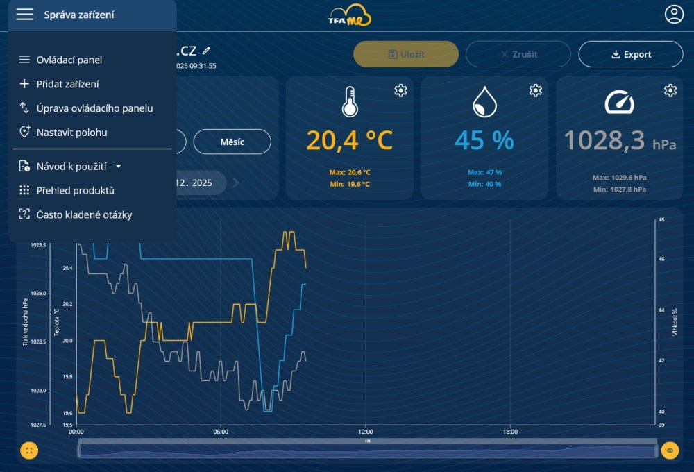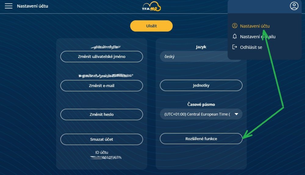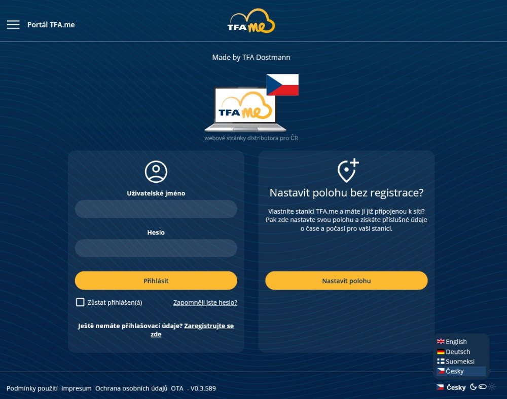 METEO blog Novinky v systému TFA.me – čeština, API, nové přístroje Novinky v systému TFA.me – čeština, API, nové přístroje 16. 01. 2026 Systém TFA.me čekalo v posledních týdnech pořádné rozšíření. Před Vánoci přibyla celá řada nových přístrojů. Jedná o nové designové domácí meteostanice, o poloprofesionální meteostanici TFA 35.8106.01 nebo o nová čidla srážek a rychlosti a směru větru. Přehled novinek najdete na konci tohoto článku. Kromě toho se ale můžete těšit i ze změn v samotném systému. Ten se právě dočkal dvou pořádných vylepšení: nově má i češtinu a pokročilí uživatelé mohou využít i API rozhraní. Ještě neznáte systém TFA.me? Jedná se o modulární WiFi systém, ve kterém můžete meteostanice nebo brány připojit k WiFi – data z měření pak uvidíte online na internetu i na dálku a na meteostanicích se navíc bude zobrazovat chytrá předpověď počasí. Více se dozvíte v tomto článku. Čeština Online portál go.tfa.me je nově i kompletně v češtině. Ovládání je proto ještě snadnější a intuitivnější. Abyste přepnuli stránky do češtiny, stačí si vybrat z nabídky jazyků vpravo dole. Náhled na výběr jazyka na vstupní stránce (jazyk lze přepnout i po přihlášení uvnitř portálu) Náhled na detail meteostanice v češtině, české menu vlevo nahoře API Pokročilí uživatelé, kteří se vyznají ve webovém programování, mohou nově využít i API rozhraní. K API klíči a k dokumentaci se dostanete zevnitř portálu po přihlášení. Stačí rozkliknout informace k účtu vpravo nahoře a vybrat možnost „Nastavení účtu“ a poté „Rozšířené funkce“ („Account Settings“ a „Extended Functions“). Jak se dostat k API klíči a dokumentaci Nové přístroje a sady Systém TFA.me se rozšířil o celou řadu nových zařízení – nové meteostanice, čidla i sady, které obsahují bránu a další přístroje. Poloprofesionální meteostanice TFA 35.8106.01 měří i srážky, rychlost a směr větru, atmosférický tlak zobrazení všech veličny na displeji 1 čidlo teploty a vlhkosti, 1 srážkoměr a 1 větroměr v balení předpověď počasí na 4 dny možnost podrobné předpovědi počasí vč. srážek, rychlosti a směru větru, UV indexu předpověď maximálních a minimálních denních teplot zobrazení času, data nebo dne v týdnu Meteostanice TFA 35.8105.02 Meteostanice TFA 35.8105.10 1 venkovní čidlo v balení zabudovaný senzor vnitřní teploty a vlhkosti osvědčený oblíbený design vnitřní jednotky předpověď počasí až na 5 dnů možnost podrobné předpovědi počasí vč. srážek, rychlosti a směru větru, UV indexu předpověď maximálních a minimálních denních teplot zobrazení času, data nebo dne v týdnu 1 venkovní čidlo v balení zabudovaný senzor vnitřní teploty a vlhkosti osvědčený oblíbený design vnitřní jednotky předpověď počasí až na 5 dnů možnost podrobné předpovědi počasí vč. srážek, rychlosti a směru větru, UV indexu předpověď maximálních a minimálních denních teplot zobrazení času, data nebo dne v týdnu Meteostanice TFA 35.8108 1 venkovní čidlo v balení zabudovaný senzor vnitřní teploty a vlhkosti přehledná předpověď počasí na 4 dny předpověď maximálních a minimálních denních teplot zobrazení času, data nebo dne v týdnu Meteostanice TFA 35.8107 1 venkovní čidlo v balení zabudovaný senzor vnitřní teploty a vlhkosti kontrastní barevný VA displej přehledná předpověď počasí na 4 dny předpověď maximálních a minimálních denních teplot zobrazení času, data nebo dne v týdnu Sada brány a srážkoměru obsahuje bránu + srážkoměr TFA 30.3903.02 zabudovaný senzor teploty a vlhkosti v bráně brána nezobrazuje údaje ze srážkoměru, pouze je přeposílá na internet brána nezobrazuje předpověď počasí zobrazení času a také data, nebo dne v týdnu Sada brány a bezdrátového teploměru/vlhkoměru obsahuje bránu a bezdrátový teploměr/vlhkoměr vč. 3 čidel teploty a vlhkosti ideální pro monitoring teploty a vlhkosti na více místech na internet se posílají údaje z bezdrátových čidel a brány (ne z displejové jednotky) aktuální teplota a vlhkost se zobrazuje na displejích bezdrátového teploměru a brány brána nezobrazuje předpověď počasí zobrazení času, data, nebo dne v týdnu Sada brány a plovoucího bazénového teploměru obsahuje bránu a plovoucí bazénový teploměr vhodné pro sledování teploty vody v bazénu, jezírku apod. (nedoporučuje se použití v mrazu) zabudovaný senzor teploty a vlhkosti v bráně brána nezobrazuje předpověď počasí zobrazení času a také data, nebo dne v týdnu Větroměr TFA 30.3904.02 větroměr pro systém TFA.me měří průměrnou rychlost a poryvy větru, směr větru solární panel, nabíjecí lithiová baterie, záložní tužkové baterie data se posílají prostřednictvím TFA.me meteostanic nebo brány a jsou viditelná na portálu go.tfa.me součástí balení poloprofesionální meteostanice TFA 35.8106 Srážkoměr TFA 30.3903.02 srážkoměr pro systém TFA.me data se posílají prostřednictvím TFA.me meteostanic nebo brány a jsou viditelná na portálu go.tfa.me součástí balení poloprofesionální meteostanice TFA 35.8106 Související produkty (14) Související produkty14 Rychlé info Novinka TFA 35.8110.02 - sada brány TFA.me a bazénového čidla Skladem 4 ks 2 290 Kč 1 892,56 Kč bez DPH Do košíku Sada WiFi brány TFA.me a plovoucího bazénového čidla. Vhodné pro sledování teploty v bazénu, jezírku apod. Rychlé info Novinka TFA 35.8109 - Sada WiFi brány TFA.me a bezdrátového teploměru TFA 30.3075.01 Poslední kus skladem 3 290 Kč 2 719,01 Kč bez DPH Do košíku Sada bezdrátového teploměru/vlhkoměru, 3 čidel a brány pro systém TFA.me. Ideální pro monito