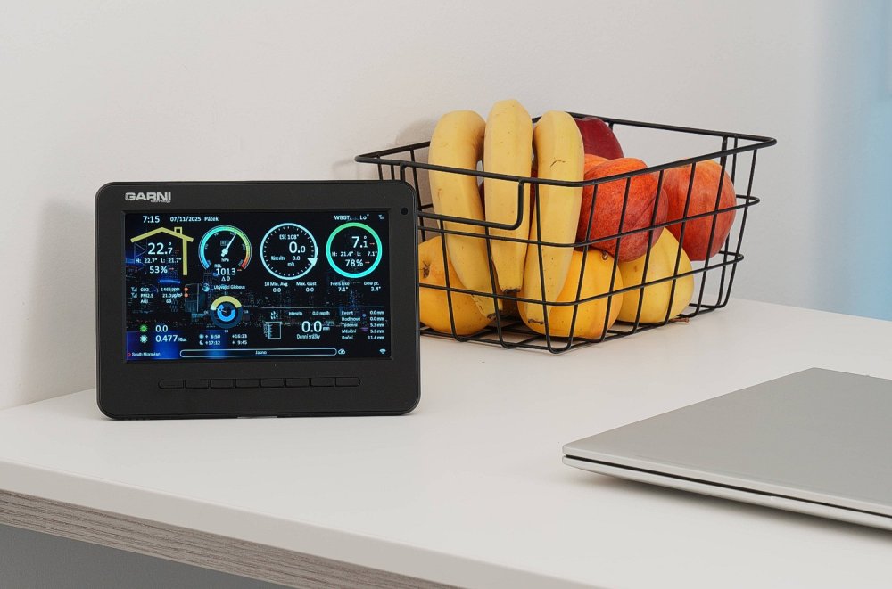 METEO blog Recenze Recenze - GARNI 3075 Arcus - devět senzorů, tisíc možností a jeden velký zážitek Recenze - GARNI 3075 Arcus - devět senzorů, tisíc možností a jeden velký zážitek 02. 12. 2025 Hledáte meteorologickou stanici, která poskytne komplexní přehled o počasí včetně internetové předpovědi? GARNI 3075 Arcus s integrovaným čidlem 9-v-1 měří vše podstatné – od teploty a vlhkosti přes vítr a srážky až po UV záření a revoluční WBGT index tepelné zátěže. Solární napájení, švýcarská čidla a možnost rozšíření až o 7 dalších senzorů z ní dělají profesionální nástroj. Barevný TFT displej s českým menu zobrazuje grafy, 14denní předpověď i kvalitu ovzduší. Má ale tato stanice i nějaké mouchy? Přečtěte si naši recenzi! Profesionální meteorologická stanice pro náročné uživatele GARNI 3075 Arcus představuje špičkové řešení pro všechny, kdo berou monitorování počasí vážně. Tato Wi-Fi meteorologická stanice s barevným TFT displejem a profesionálním integrovaným bezdrátovým čidlem 9-v-1 GARNI 2NG nabízí komplexní přehled o aktuálních povětrnostních podmínkách. Stanice shromažďuje přesná meteorologická data, která v reálném čase odesílá prostřednictvím vestavěného Wi-Fi modulu na meteorologické servery jako ProWeatherLive, Weather Underground, Weathercloud nebo na vlastní uživatelský server. Zároveň přijímá z internetu 24hodinovou nebo 14denní předpověď počasí přímo do hlavní jednotky. Výrobce vsadil na kvalitní komponenty včetně vysoce přesných švýcarských čidel SENSIRION, což zaručuje spolehlivost měření. Stanice je určena jak pro profesionální meteorologické pozorovatele, tak pro nadšence do počasí, kteří oceňují detailní data a možnost jejich dlouhodobého sledování a analýzy. GARNI 3075 Arcus - Wi-Fi meteostanice s čidlem 9-v-1 Obsah balení - vše potřebné pro okamžité zprovoznění Balení meteorologické stanice GARNI 3075 Arcus obsahuje vše nezbytné pro instalaci a okamžité uvedení do provozu. Najdete v něm hlavní přijímací jednotku s displejem, integrované bezdrátové čidlo 9-v-1 a kompletní montážní sadu. Součástí montážní sady není žádný instalační stožár, ale jen stojánek s montážní objímkou, do které patří plastová tyč, na které je již přepevněné čidlo 9-v-1. K napájení hlavní jednotky slouží síťový adaptér s odnímatelným USB napájecím kabelem, pro zálohu času a data je přiložena knoflíková baterie CR2032. Součástí balení je také podrobný návod v různých jazycích. Montážní sada umožňuje upevnění venkovního čidla jak na stožár o průměru 30-40 mm, tak na rovnou plochu, což poskytuje flexibilitu při výběru instalačního místa. V balení najdete vše potřebné Integrované bezdrátové čidlo 9-v-1 – srdce měřicího systému Venkovní integrované čidlo GARNI 2NG představuje technologicky vyspělé řešení, které v jednom kompaktním pouzdře kombinuje devět různých senzorů. Měří venkovní teplotu a relativní vlhkost, rychlost a směr větru, úhrn srážek, UV index, intenzitu slunečního záření, WBGT index a barometrický tlak. Čidlo má voděodolné provedení s krytím IPX4 a je vybaveno solárním panelem s vestavěným kapacitorem, který zajišťuje energetickou soběstačnost. Solární panel lze vertikálně naklápět v různých úhlech pro optimální využití slunečního záření dle zeměpisné polohy místa instalace. Jako záložní zdroj slouží tři baterie AA. Bezdrátový přenos dat probíhá na frekvenci 868 MHz s dosahem až 150 metrů v otevřeném prostoru, interval přenosu je pouhých 12 sekund. Integrované bezdrátové čidlo 2NG Možnosti rozšíření – modulární systém pro specifické potřeby Jednou z největších předností stanice GARNI 3075 Arcus je možnost rozšíření o další bezdrátová čidla podle individuálních potřeb uživatele. Stanice podporuje připojení až 7 bezdrátových čidel pro měření teploty a relativní vlhkosti (modely GARNI 055H, GARNI 055H 2GEN, GARNI 056H), což umožňuje monitorování různých místností v domě nebo specifických míst venku. K dispozici jsou také specializovaná čidla jako GARNI 071S pro měření teploty a vlhkosti půdy nebo GARNI 057P pro měření teploty vody v bazénu. Pro sledování kvality ovzduší lze připojit čidlo GARNI 104Q měřící koncentraci pevných částic PM2.5 a PM10 nebo čidlo GARNI 102Q pro měření koncentrace CO2. Zajímavým doplňkem je čidlo GARNI 072L pro detekci blesků. Všechna volitelná čidla se prodávají samostatně. Stanice v menu a grafech podporuje i další typy čidel (HCHO, VOC, CO, únik vody), které výrobce zatím nenabízí, což naznačuje možné budoucí rozšíření produktové řady. Všechna připojená čidla se zobrazují na displeji hlavní jednotky včetně barevné indikace kvality pro čidla znečišťujících látek. Možnosti rozšíření o další senzory jsou opravdu bohaté WBGT index – nový parametr pro reálné vnímání tepelné zátěže Jednou z nejvýznamnějších inovací této meteorologické stanice je měření WBGT indexu (Wet Bulb Globe Temperature). Tento ukazatel tepelné zátěže organismu na přímém slunci poskytuje mnohem realističtější obraz o skutečných tepelných podmínkách než běžný teplotní index. Zatímco klasický teplotní index zohledňuje pouze teplotu a vlhkost vzduchu, WBGT index do výpočtu zahrnuje také rychlost větru, úhel slunce a intenzitu slunečního záření (radiaci). Díky tomu dokáže přesněji vyjádřit, jaké tepelné podmínky skutečně pociťuje lidské tělo při fyzické námaze, například při práci nebo sportu venku. WBGT se zobrazuje na hlavní obrazovce s rozlišením na jedno desetinné místo, rozsah zobrazení 