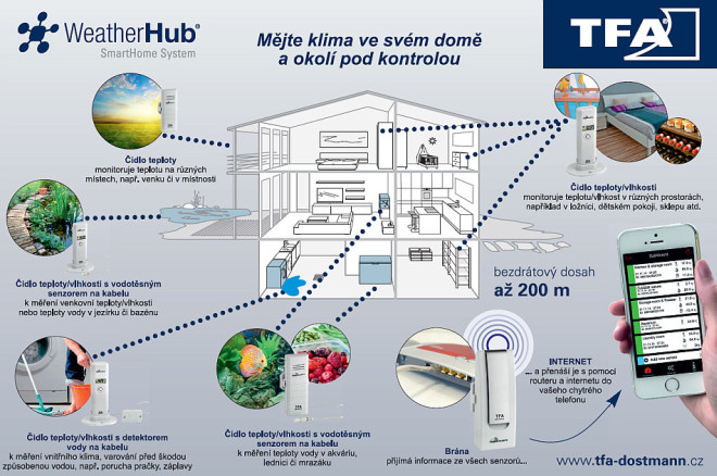 METEO blog Tipy, rady a zajímavosti Snadný vzdálený monitoring pomocí mobilní aplikace. Znáte systém WEATHERHUB? Snadný vzdálený monitoring pomocí mobilní aplikace. Znáte systém WEATHERHUB? 02. 09. 2025 Bazén, zahrada, sklep, chalupa, sklad, skleník... jsou zkrátka místa, která chcete pod kontrolou, i když jste zrovna někde jinde. Přijde k ránu mráz a bude třeba přemístit rostliny domů? Jsou správně zavřeny dveře mrazáku? Mají ryby v akváriu správnou teplotu vody? Pršelo dostatečně nebo se zahrada musí pozalévat? Jsou všechna okna a dveře zavřené? Mobilní monitorovací systém WEATHERHUB nabízí komfortní, snadný a cenově dostupný způsob, jak tyto informace kdykoli získat. Bez ohledu na to, kde zrovna jste. WEATHERHUB totiž umožňuje vzdálené sledování potřebných míst přes mobilní aplikaci, odkudkoliv na světě, stačí být připojený k internetu. Pojďme se podívat na to, v čem je systém WEATHERHUB tak jednoduchý, intuitivní, modulární a bezdrátový. JEDNODUŠE Systém WEATHERHUB je velmi oblíbený kvůli velice snadnému zprovoznění a ovládání. K jeho používání vám totiž stačí mít na místě měření router s připojením k internetu a chytré mobilní zařízení v ruce. Ke zprovoznění stačí pouze 4 kroky: 1. stažení aplikace, 2. zapojení brány (komunikátoru) pomocí LAN síťového kabelu do routeru, 3. vložení baterií do zakoupených čidel, a 4. načtení QR kódu z čidel do mobilní aplikace. INTUITIVNĚ Ovládání aplikace je také velmi snadné, stačí základní znalost angličtiny nebo němčiny a aplikace vás sama navede. Snadno si tak můžete prohlížet aktuální hodnoty, zabrousit do historie 3 měsíce zpátky, zkontrolovat stav baterií v čidlech nebo zobrazit hodnoty v grafické podobě. Aplikaci si také můžete přizpůsobit podle svých potřeb – každé z čidel je možné pojmenovat (a kdykoliv přejmenovat) a nastavit k němu odpovídající alarmy hodnot. Díky intuitivní a snadno použitelné aplikaci může nastavit horní či dolní alarmy, případně upozornění na detekci vody nebo otevření dveří. V případě překročení nastavené hodnoty směrem dolů či nahoru vás aplikace upozorní notifikací (podobně jako SMS), že došlo ke spuštění alarmu. Naměřená data jsou v aplikaci k dispozici po dobu nejméně 90 dní (u vybraných čidel i neomezeně). Velkou výhodou je i možnost zpřístupnit data neomezenému počtu uživatelů, takže je mohou snadno sledovat například i další členové rodiny. MODULÁRNĚ Prvním krokem před pořízením systému WEATHERHUB je výběr vhodného startovacího balíčku. Těch je aktuálně k dispozici 12 a každý z nich obsahuje bránu a alespoň jedno čidlo. Narozdíl od striktně uzavřených systémů tady ale WEATHERHUB teprve začíná. K jedné bráně totiž můžete připojit až 50 různých bezdrátových čidel a modulů. Vybírat můžete mezi 19 různými čidly, které jsou určeny pro: měření teploty vzduchu (s externím kabelem i bez), vlhkosti vzduchu, tlaku vzduchu, množství srážek, síly a směru větru, teploty vody, detekce vody v okolí a otvírání dveří a oken. Startovací balíčky: Přídavná čidla a moduly: TFA 31.4001.02 WEATHERHUB – set č. 1 Součástí setu je brána, čidlo teploty – ideální startovní sada pro měření teploty v dětském pokoji, ložnici nebo ve sklepě. TFA 31.4002.02 WEATHERHUB – set č. 2 Součástí setu je brána, čidlo teploty s kabelem – startovní sada vhodná pro všechny, kdo mají doma bazén, terárium, akvárium či chtějí monitorovat teplotu v mrazáku, lednici atd. TFA 30.3301.02 - čidlo teploty s vodotěsným kabelovým senzorem – měří teplotu a dále pak teplotu na kabelu - ideální pro měření teploty např. v mrazáku, lednici, akváriu či teráriu TFA 31.4003.02 WEATHERHUB – set č. 3Součástí setu je brána, srážkoměr – startovní sada vhodná pro všechny, kdo chtějí sledovat množství spadených srážek např. na zahradě. TFA 30.3302.02 - čidlo teploty a vlhkosti s displejem s vodotěsným kabelovým senzorem – verze PRO - měří teplotu a vlhkost a dále pak teplotu na profi kabelu - ideální pro měření teploty např. v mrazáku, lednici, bazénu, akváriu či teráriu TFA 31.4004.02 WEATHERHUB – set č. 4 Součástí setu je brána, čidlo teploty s kabelem, srážkoměr – startovní sada vhodná pro všechny, kdo mají doma bazén, terárium, akvárium či chtějí monitorovat teplotu v mrazáku, lednici a zároveň sledovat množství spadených srážek např. na zahradě. TFA 30.3303.02 - čidlo teploty a vlhkosti s displejem - ideální pro měření teploty a vlhkosti např. v dětském pokoji, ložnici, sklepě, skleníku atd. TFA 31.4005.02 WEATHERHUB – set č. 5 Součástí setu je brána, čidlo teploty/vlhkosti, srážkoměr, větroměr – domácí meteorologická stanice, vhodná pro všechny ty, kdo chtějí mít okamžitý a kompletní přehled o počasí. TFA 30.3304.02 - čidlo teploty a vlhkosti s displejem a kabelovým senzorem – vhodné pro měření teploty a vlhkosti venku a zároveň kontrolu teploty např. vody v bazénu. TFA 31.4006.02 WEATHERHUB – set č. 6 Součástí setu je součástí setu je brána, větroměr – startovní sada vhodná pro všechny, kteří potřebují měřit rychlost a směr větru. TFA 30.3305.02 - čidlo teploty a vlhkosti s displejem a detekcí vody na kabelu – vhodné pro měření teploty/vlhkosti na dalším místě. Kabelový senzor s detekcí vody slouží pro varování před škodou způsobenou vodou, např. porucha pračky, záplavy atd. TFA 31.4008.02 WEATHERHUB – set č. 8 Součástí setu je brána, vnitřní teploměr/vlhkoměr, čidlo teploty a vlhkosti – perfektní sada pro ty, kteří chtějí žít zdravě a hlídat si doma ideální klima, tj. správnou teplotu a vlhk