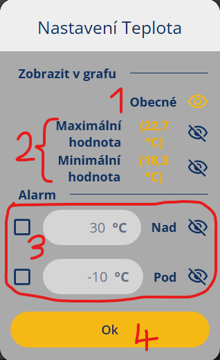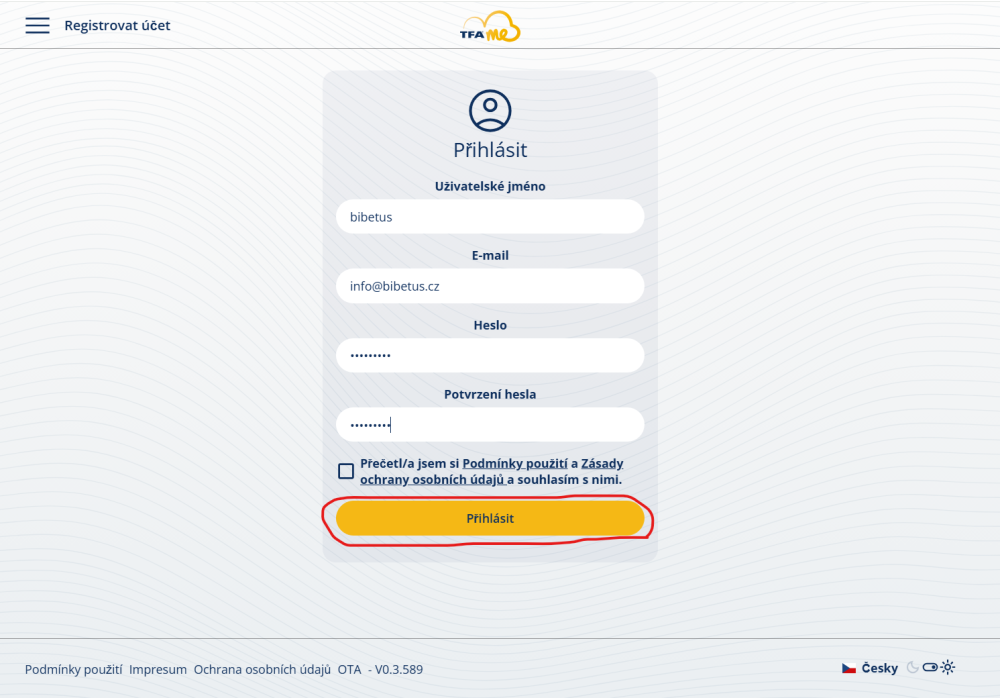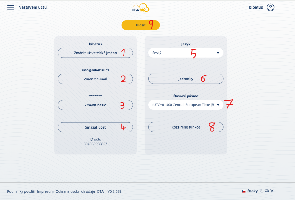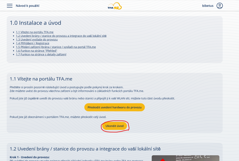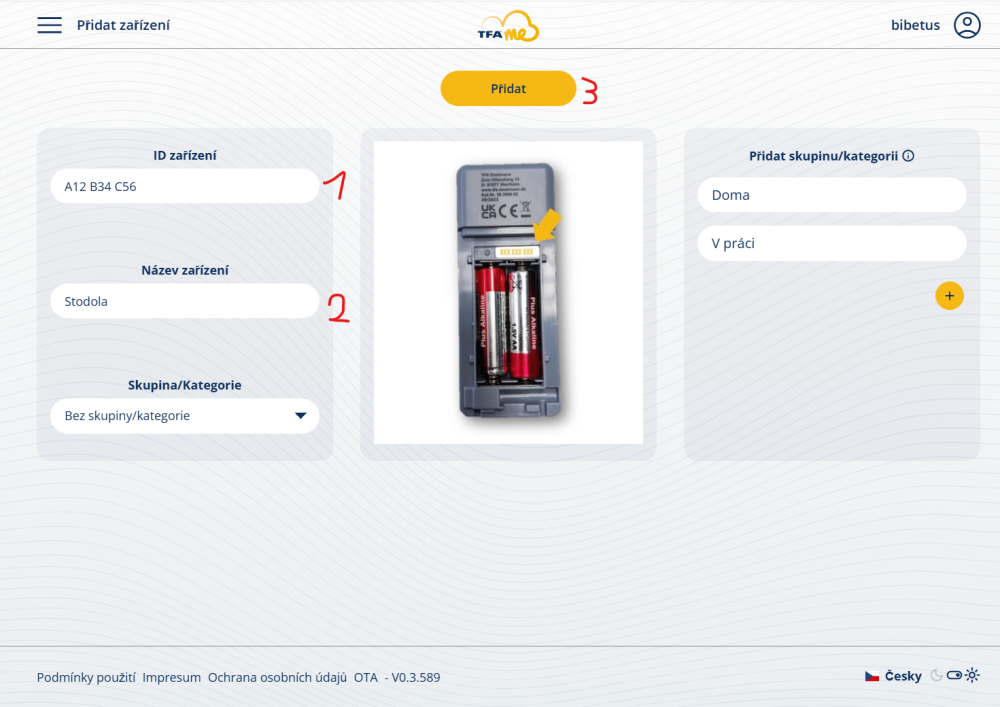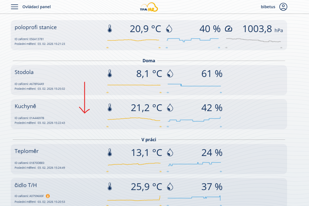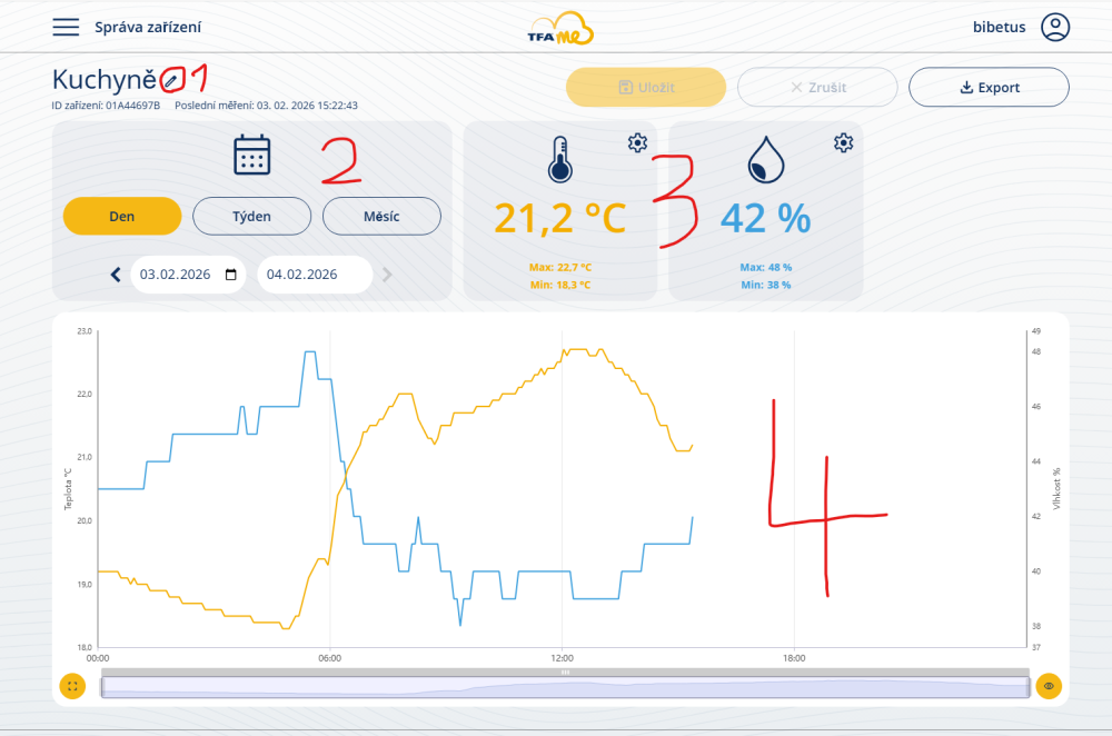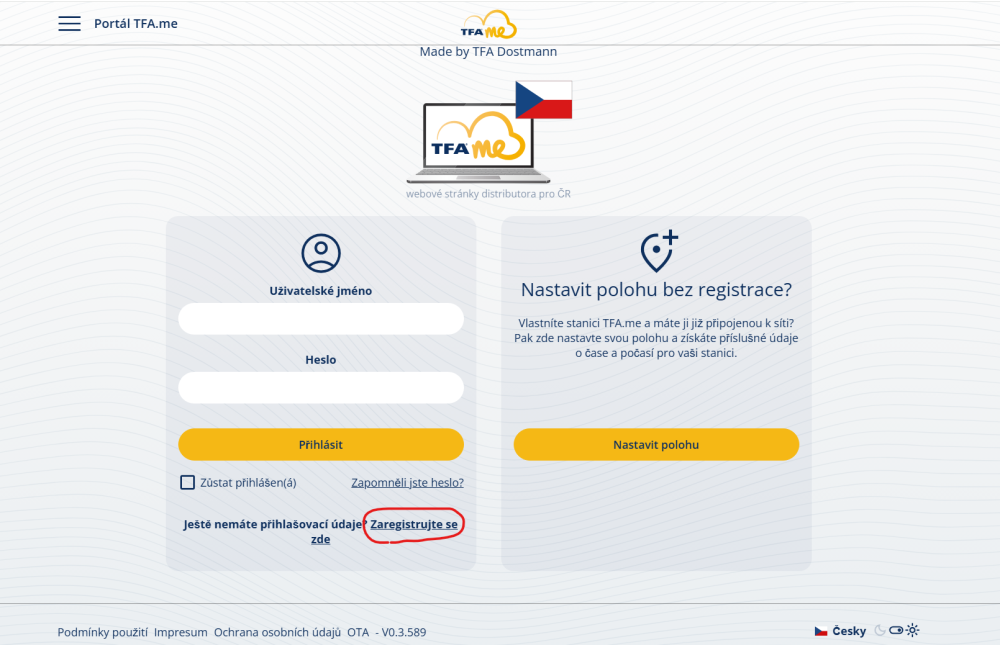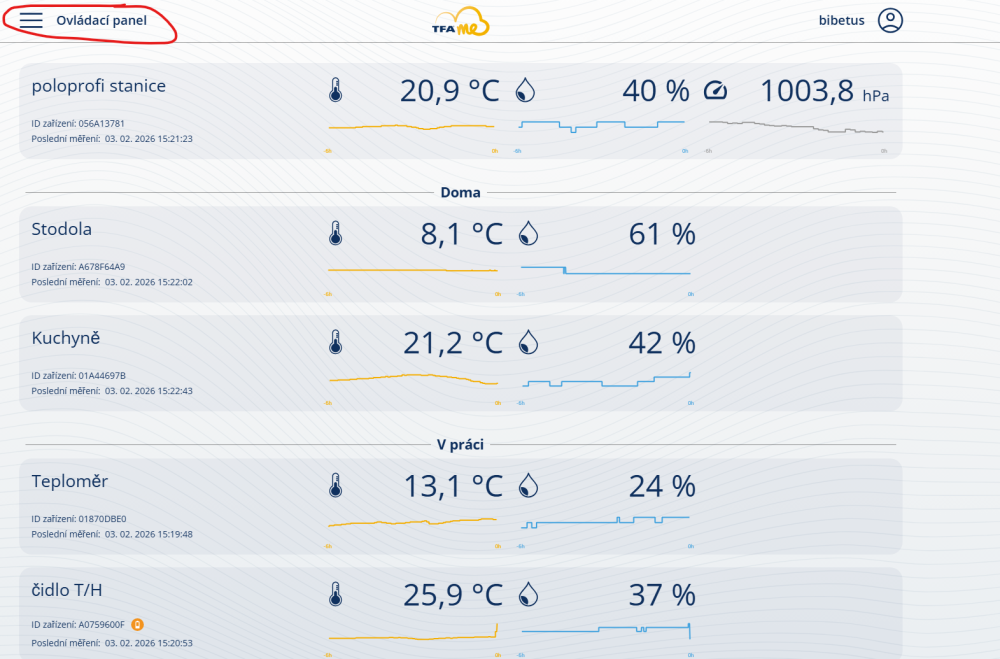 METEO blog Tipy, rady a zajímavosti TFA.me - seznámení a základní práce s portálem TFA.me - seznámení a základní práce s portálem 03. 02. 2026 Jak připojit a ovládat měřicí zařízení řady TFA.me?Připravili jsme pro Vás detailní návod pro práci s portálem go.tfa.me a to od samotného připojení zařízení až po detailní nastavení různých produktů z řady TFA.me. V případě, že byste měli při práci s tímto portálem nějaký problém, neváhejte nás kontaktovat, rádi Vám pomůžeme. Upozornění: Tento článek nepopisuje samotné uvedení brány / stanice do provozu a integraci do vaší lokální sítě, což je nutnou podmínkou proto, abyste na portále go.tfa.me mohli vidět nějaké naměřené údaje. V případě, že potřebujete poradit jak připojit bránu či stanici k wifi, doporučujeme se podívat na toto video. Časté kladné dotazy k systému TFA.me najdete na speciální stránce. V následujicím článku naleznete tyto body: Založení účtu na portále go.tfa.me Připojení měřicích zařízení Ovládací panel Správa měřicího zařízení Nastavení profilu Tip na závěr pro mobilní zařízení 1. Založení účtu na portále go.tfa.me Pro obsluhu zařízení TFA.me slouží webový portál https://go.tfa.me/. Po rozkliknutí odkazu stačí kliknout na registrace, vyplnit Váše údaje a potvrdit vytvoření účtu. Následně Vám bude na email zaslán potvrzovací odkaz, který po nakliknutí aktivuje Váš účet. Teď už se stačí jen přihlásit Obrázek 1 - úvodní strana Obrázek 2 - registrace uživatelského účtu 2. Připojení měřicích zařízení Po přihlášení se automaticky otevře stránka s kompletním návodem s možnostmi volby jazyka (může být v angličtině, němčině, ale je zde možnost výběru i češtiny). Pro jeho přeskočení stačí kliknout na tlačítko Ukončit úvod. Ihned se dostáváte na stránku pro přidání zařízení, kde jednoduše vyplníte ID zařízení (1), které naleznete na konkrétním zařízení. V další kolonce vytvoříte Název pro zařízení (2). Pokud měřicích zařízení budete mít více či budou rozmístěna na více místech, tak je velkou výhodou, že si můžete taková zařízení uspořádat či rozdělit do různých skupin/kategorií, které si můžete pojmenovat dle potřeby. Nakonec kliknete na žluté tlačítko Přidat. 3. Ovládací panel Uživatelské rozhraní TFA.me je intuitivní a jednoduché pro snadnou orientaci. V levém horním rohu naleznete rozklikávací menu, které slouží pro navigaci uživatelským rozhraním. Hlavní stránkou, na které se nyní nacházíte, se říká Ovládací panel. Zde naleznete veškerá Vaše připojená zřízení. Druhý odkaz Přidat zařízení Vám umožní přidat nové zařízení viz. odstavec 2. Třetí odkaz Úprava ovládacího panelu slouží pro úpravu pozic a mazání již přidaných zařízení nebo skupin/kategorií. Odkaz Nastavit polohu umožní určit polohu meteostanice, pro kterou se bude zobrazovat předpověď počasí (pokud zařízení disponuje funkcí zobrazení předpovědi počasí na displeji). Na odkazech pod linkou pak naleznete návody, odkaz na přehled všech produktů a často kladené dotazy. 4. Správa měřicího zařízení Na stránce Ovládací panel se zobrazují všechny doposud přidané senzory a brány. Pro více informací a správu jednoho zařízení stačí kliknout na vybraný řádek. Tlačítko tužky Vám umožní změnit název zařížení. V poli č. 2 můžete nastavit, pro jaké období si přejete zobrazit data v grafu níže. Lze navolit poslední den, týden, měsíc nebo zadat konkrétní datum, od kdy do kdy si přejete zobrazit naměřené hodnoty. Napravo od nastavení sledovaného období (pole č. 3) pak vidíte aktuální měřené hodnoty (zde konkrétně teplotu a vlhkost). Níže poté minimální a maximální naměřené hodnoty pro zvolené období. V grafu ve spodu obrazovky (pole č. 4) můžete vidět průběžně naměřené hodnoty, přičemž barvy vždy odpovídají jednotlivým veličinám z pole číslo 3. U aktuálně naměřených hodnot (pole č. 3) můžete skrze ozubené kolečko v pravém horním rohu upravit konkrétní zobrazované hodnoty. Zdali se graf konkrétního údaje zobrazí. Zobrazení rysky pro minimální a maximální hodnoty. Nastavení upozornění v případě překročení konkrétní hodnoty směrem nahoru či dolů. Tlačítko OK poté slouží pro uložení a aplikování změn. Pokud dojde ke změně sledovaného období, a přejete si, aby vybrané období bylo výchozí, doporučujeme si v pravém horním rohu toto nastavení uložit. V případě, že budete zkoumat různá období a měnit nastavení, a následně se budete chtít vrátit k původnímu nastavení, klikněte na tlačítko Zrušit. Pokud nastavení změníte a uložíte, tlačítko Zrušit Vás vrátí na poslední uložené nastavení.Nasbíraná data lze také ukládat přímo do vašeho zařízení. K ukládání slouží tlačítko Export v pravém horním rohu. Po rozkliknutí se Vám zobrazí výběrové okno, které Vám umožní přes tlačítko napravo stáhnout si graf, historii naměřených hodnot, nebo upozornění. Mějte však na paměti, že data, která ukládáte jsou vždy pro zvolené sledované období, které bylo uloženo. Při zaškrtnutí pole Automatické se Vám vždy po ukončení sledovaného období zašle výpis hodnot vybrané položky, a to na email, který je navázaný na účet. 5) Nastavení profilu V případě, že si budete přát změnit některé údaje Vašeho účtu, lze tyto změny společně s dalším nastavením nalézt v pravém horním rohu. Po kliknutí na Vaše uživatelské jméno se dostanete do menu, kde lze provádět následující změny a úkony: Změnit si uživatelské jméno. Změnit email účtu, který je aktuálně přihlášený.