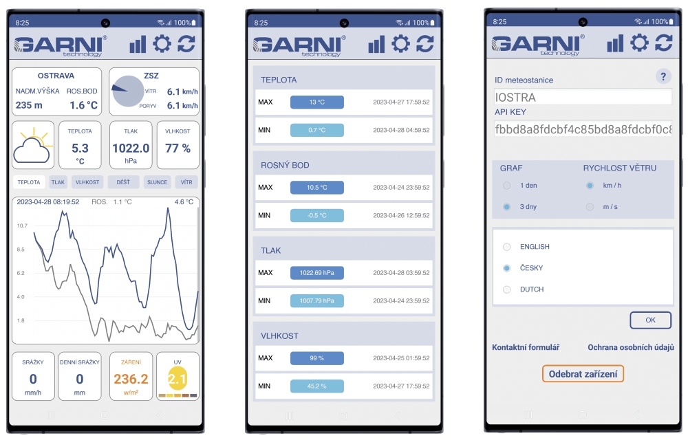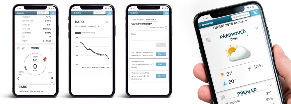 Meteostanice Digitální Poloprofi GARNI 3075 - WiFi meteorologická stanice Meteostanice Digitální Poloprofi GARNI 3075 - WiFi meteorologická stanice GARNI 3075 - WiFi meteorologická stanice hvězda 1hvězda 2hvězda 3hvězda 4hvězda 5 (1) Počet hvězdiček je 5 z 5 PředchozíDalší Další fotky (8) PředchozíDalší Přidat do oblíbených Přidat do porovnání Integrované čidlo 9-v-1. Možnost dokoupení přídavných čidel. Zabudovaná paměť a přenos dat do PC přes USB kabel. Online funkce, posílání dat na vynikající server ProWeatherLive, dále na Weather Underground, Weathercloud. Možnost posílat data na Vaše vlastní stránky. Více Novinka 10 985 Kč s DPH Skladem 2 ks ks Do košíku EAN: 8592733021527 Kód produktu: GA01013075 Doprava od 55 Kč Máte dotaz? Vojtěch Krejčí Produktový specialista +420 544 214 627 info@meteoshop.cz webový formulář K dispozici Po - Pá v čase 8-12,13-16 Popis Info o výrobci Články5 Diskuse0 Wi-Fi meteorologická stanice s TFT displejem, 24hodinovou / 14denní předpovědí a profesionálním integrovaným bezdrátovým čidlem 9-v-1 GARNI 3075 Arcus shromažďuje přesná a detailní meteorologická data, která jsou následně v reálném čase odesílána pomocí vestavěného Wi-Fi modulu a místní Wi-Fi sítě na meteorologické servery, jako jsou ProWeatherLive (PWL), Weather Underground, Weathercloud, nebo na uživatelský server. Ty umožňují automatizované nahrávání dat z meteorologické stanice a volný přístup ke všem datům odkudkoli s přístupem na Internet, přes webový prohlížeč nebo mobilní aplikaci. Zároveň PWL server posílá 24hodinovou/14denní předpověď počasí do hlavní jednotky. TFT displej hlavní jednotky je lokalizován do češtiny s možností volby z dalších 9 jazyků. Toto špičkové zařízení poskytuje spolehlivý výkon pro komplexní a přesné monitorování povětrnostních podmínek jak pro profesionální meteorologické pozorovatele, tak pro nadšence do počasí. Díky rozsáhlé sadě čidel, integrovanému bezdrátovému čidlu 9-v-1 GARNI 2NG, je schopno měřit parametry, jako jsou teplota, vlhkost, rychlost a směr větru, úhrn srážek, UV index, sluneční záření, WBGT a barometrický tlak. Bezdrátový přenos na vzdálenost až 150 metrů v otevřeném prostoru zajišťuje spolehlivý sběr dat z různých environmentálních podmínek. Integrované solárně napájené bezdrátové čidlo 9-v-1 obsahuje vestavěný kapacitor, který zajišťuje vyšší energetickou účinnost a spolehlivost i při nízké úrovni osvětlení, zároveň minimalizuje potřebu údržby. Baterie slouží jako záložní zdroj. Novou veličinou je WBGT - ukazatel tepelné zátěže organismu na přímém slunci. Na rozdíl od běžného teplotního indexu zohledňuje nejen teplotu a vlhkost vzduchu, ale také rychlost větru, úhel slunce a sluneční záření (radiaci), čímž poskytuje realističtější obraz o tom, jaké tepelné podmínky skutečně pociťuje lidské tělo při námaze, například při práci nebo sportu venku. Pro tuto meteorologickou stanici byla použita vysoce přesná švýcarská čidla SENSIRION. Server ProWeatherLive (PWL) je pro uživatele této meteorologické stanice doživotně zcela zdarma. Hlavní výhody používání serveru ProWeatherLive: je kompletně v češtině pokryje dlouhodobou historii měření s možností stažení dat do počítače disponuje webovým rozhraním pro přístup z internetového prohlížeče pro mobilní zařízení je k dispozici aplikace rovněž lokalizovaná do češtiny zobrazuje také data z volitelných čidel bez poplatků Hlavní jednotka disponuje intuitivním, vysoce kontrastním HD TFT displejem, který zobrazuje předpovědi počasí, maximální, minimální a celkové hodnoty, historická data a aktuální měření ze všech připojených čidel. Přídavné funkce, jako je automatické nastavení jasu, výstrahy na vysoké/nízké hodnoty a rozsáhlé možnosti kalibrace, činí tuto stanici výjimečným nástrojem pro detailní analýzu počasí – a to vše bez nutnosti použití stolního počítače. Hlavní jednotka je osazena vysokorychlostními procesory, které analyzují naměřené hodnoty meteorologických veličin a ty pomocí místní Wi-Fi sítě v reálném čase nahrává na zvolený server/servery, známé meteorologické služby Weather Underground, Weathercloud a ProWeatherLive, na server PocasiMeteo.cz, případně na vlastní server uživatele. Zasílání dat je možné na všechny servery současně. Konfigurační aplikace WSLink Nastavení meteorologické stanice se provádí přes aplikaci WSLink a to pro Android a iOS. Pomocí aplikace WSLink se nastavuje připojení hlavní jednotky k místní WiFi síti, nastavení meteorologického serveru, kalibrace měřených veličin a aktualizace firmwaru.Displej barevný TFT HD displej o rozměrech 154 x 86 mm, rozlišení 1024 x 600 px osvětlení displeje je stálé, možnost volby tmavého pozadí displeje, nebo volby ze 4 fotografií, nebo střídání fotografií (prezentace) po 1, 10, 30 minutách, po hodině, nebo po 1 dni, nastavení jasu, kontrastu, úrovně osvětlení, možnost automatického přepínání jasu na základě okolního světla, nastavení nočního režimu osvětlení automatického, nebo v nastavený čas možnost nastavení menu a veškerého textu na displeji v češtině, němčině, angličtině, španělštině, francouzštině, italštině, nizozemštině, maďarštině, polštině a slovenštině velikost některých číslic a znaků v základním zobrazení: vnitřní a venkovní teplota, srážky, rychlost větru 6,5 mm, vnitřní a venkovní relativní vlhkost 4 mm, barometrický tlak, UV index, intenzita slunečního 3,5 mm, WBGT 2,5 mm, čas 4 mm, datum 2 mm různé režimy zobrazení displeje: základní, kde je zobrazena vnitřní a venkovní teplota a relat