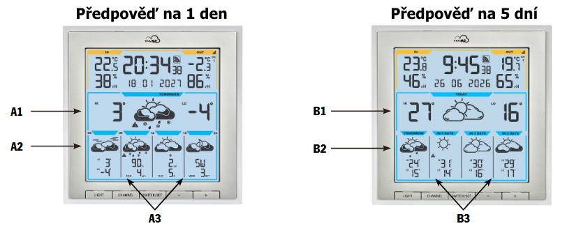 Meteostanice Digitální Domácí TFA 35.8105.02 - Bezdrátová WiFi meteostanice s chytrou předpovědí TFA.me ID-08 Meteostanice Digitální Domácí TFA 35.8105.02 - Bezdrátová WiFi meteostanice s chytrou předpovědí TFA.me ID-08 TFA 35.8105.02 - Bezdrátová WiFi meteostanice s chytrou předpovědí TFA.me ID-08 PředchozíDalší Další fotky (11) PředchozíDalší Přidat do oblíbených Přidat do porovnání Meteostanice s oblíbeným osvědčeným designem a WiFi funkcemi: zobrazení profesionální předpovědi z internetu, naměřená data se posílají na online cloud TFA.me, kde jsou k dispozici statistiky a grafy. Možnost rozšířit o další čidla. Více Novinka 20 let TFA.me design 2 290 Kč s DPH Skladem 5 ks a více ks Do košíku EAN: 4009816043566 Kód produktu: TFA35.8105.02 Doprava od 55 Kč Máte dotaz? Vojtěch Krejčí Produktový specialista +420 544 214 627 info@meteoshop.cz webový formulář K dispozici Po - Pá v čase 8-12,13-16 Popis Info o výrobci Články4 Diskuse0 Meteostanice s profesionální chytrou předpovědí počasí stahovanou z internetu přes WiFi. Meteostanice dále měří teplotu a vlhkosti venku i uvnitř, údaje z měření se posílají na portál go.tfa.me. Zde máte k dispozici statistiky, grafy, tabulky, e-mailové alarmy atd. Portál go.tfa.me lze pohodlně prohlížet přes internetový prohlížeč na telefonu, PC nebo tabletu. Možnost rozšíření o další čidla. Další informace o systému TFA.me a přehled produktů najdete v článku na blogu. Předpověď počasí Jaké bude počasí? Bude jasno nebo zamračeno? Pokud potřebujete, aby vaše meteostanice zobrazovala skutečně profesionální předpověď počasí, systém TFA.ME je přesně pro vás. Tato meteostanice pravidelně stahuje z internetu přes WiFi kvalitní německou předpověď počasí ze serveru wetter.com. Model TFA 35.8105 dokáže zobrazit předpověď počasí až na 5 dnů. Podle nastavení si můžete zobrazit detailní předpověď na 1 den rozdělenou do 6hodinových bloků (pro kterýkoliv z 5 dnů), nebo celodenní předpovědi na 5 dnů. U všech předpovědí se zobrazuje předpovídaná denní nejvyšší a nejnižší teplota. U detailní předpovědi se navíc zobrazuje i předpověď srážek, délky slunečního svitu, UV indexu, rychlosti a směru větru pro zvolený den. V případě nebezpečí (silný vítr, přívalové deště, ledovka apod.) se na displeji zobrazí varovný symbol. Aby tato předpověď správně fungovala, při spuštění meteostanici připojíte k internetu přes WiFi síť a zadáte její polohu. A1: Symbol předpovědi počasí pro zobrazený den, předpověď max. a min. denní teploty A2: Symbolová předpověď pro části dne (noc, dopoledne, odpoledne, večer) A3: Dodatečná detailní předpověď počasí, max. a min. denní teploty, předpověď deště – množství srážek a pravděpodobnost deště, počet hodin jasného slunečního svitu, UV index, rychlost větru a směr větru. B1: Symbol předpovědi, max. a min. teplota pro dnes B2: Symbol předpovědi pro zítra, pozítří, popozítří a za 4 dny B3: Předpověď max. a min. teploty pro jednotlivé dny Displej, čidla teploty a vlhkosti Vzhled meteostanice vychází z populárního staršího modelu TFA WETTERdirekt EOS Max. Jde tedy o osvědčenou klasiku s novými, moderními funkcemi. Displej je možné mít trvale podsvícený, nebo lze podsvícení vypnout. Nechybí funkce automatického ztlumení podsvícení na nejnižší stupeň jasu v nastaveném časovém úseku (v noci). Kromě údajů o počasí meteostanice zobrazuje i přesný čas seřízený z internetu a dále datum nebo název dne v týdnu. Meteostanice má dále v sobě zabudovaný senzor vnitřní teploty a vlhkosti. Model TFA 35.8105 se dodává s 1 bezdrátovým venkovním čidlem v balení. Další čidla lze dokoupit: na svém displeji dokáže meteostanice zobrazovat údaje až z 5 čidel teploty nebo teploty/vlhkosti pro systém TFA.me (např. TFA 30.3900.02). Pokud byste chtěli, k meteostanici lze dokoupit i další čidla např. rychlosti a směru větru (TFA 30.3904.02) nebo srážkoměr (TFA 30.3903.02), data z nich budou k dispozici na portálu go.tfa.me (ne na displeji). Přehled kompatibilních čidel najdete v článku na blogu. Posílání dat na portál TFA.me Meteostanice dokáže posílat na internet vlastní naměřené údaje nebo údaje z kompatibilních vnějších čidel v dosahu. Data jsou pak dostupná na portálu přímo od výrobce go.tfa.me. K tomu se přistupuje přes jakýkoliv internetový prohlížeč, použít tedy můžete telefon, tablet nebo počítač. Díky tomu můžete snadno vzdáleně sledovat naměřené údaje odkudkoliv. Na portálu si u jednotlivých měřidel můžete prohlížet aktuální hodnoty, grafy, stáhnout si data z měření v .csv (otevřete si např. v Excelu) nebo si můžete nastavit alarmy (e-mail). Použít takto můžete až 50 různých čidel a zařízení (na displeji lze zobrazit max. 5 čidel teploty/vlhkosti). Naměřené údaje z jednotlivých čidel se na portálu ukládají min. na 12 měsíců. Portál je v angličtině nebo němčině. Náhledy portálu go.tfa.me: Napájení Aby mohla meteostanice správně fungovat a udržovat připojení k internetu, je potřeba ji napájet dodaným adaptérem z elektrické sítě (baterie slouží jako záložní pro uchování nastavení). Venkovní čidla se napájí bateriemi. Klíčové vlastnosti: Profesionální předpověď počasí z wetter.com na 5 dnů Detailní rozlišení předpovědi díky 40 různým symbolům Možnost zobrazení detailní předpovědi na jednotlivé dny (pro všech 5 dnů předpovědi, rozdělená do 6hodinových bloků, vč. pravděpodobnosti deště, množství srážek, hodin jasného slunečního svitu, UV indexu, rychlosti a směru větru) Celodenní předpovědi počasí na 5 dnů U všech předpovědí i 