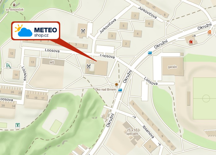 O nás Prodejna Prodejna v Brně Kamenná prodejna v Brně - showroom Rádi vás obsloužíme v naší kamenné prodejně METEOshop.cz, která se nachází v Brně na adrese Loosova 262/1. Na prostorné ploše o rozloze přibližně 90 m² jsme pro vás připravili široký výběr kvalitních meteorologických přístrojů, které si můžete před nákupem osobně prohlédnout a vyzkoušet. Osobní přístup a odborné poradenství V naší prodejně na vás čeká tým vyškoleného a přátelského personálu, který vám rád pomůže s výběrem nejvhodnějšího přístroje podle vašich potřeb. Díky našim zkušenostem a odborným znalostem vám dokážeme poradit nejen s technickými parametry jednotlivých zařízení, ale také s jejich praktickým využitím v různých situacích. Výhody návštěvy kamenné prodejny Návštěva naší prodejny vám přináší jedinečnou možnost si vámi zvolený produkt před koupí osobně osahat a otestovat jeho funkce. Na rozdíl od online nákupu tak máte jistotu, že si vybíráte přesně to, co potřebujete. Náš personál je vám k dispozici pro zodpovězení všech otázek a pomůže vám najít ideální řešení pro vaše potřeby. Jak se k nám dostanete Naše prodejna je snadno dostupná jak automobilem, tak městskou hromadnou dopravou. Pokud preferujete veřejnou dopravu, vystupte na zastávce Loosova - použijte autobusovou linku 57. Pokud byste hledali nějaký záchytný bod, tak tím bodem bude určitě nevšední přístřešek zastávky ve směru do města, který nese podobu Kaplického blobu. Autem u nás pohodlně zaparkujete Přímo před prodejnou je možné parkovat a pokud by nebylo možné zaparkovat podél příjezdové cesty, tak naprosti je dostatečně velké parkoviště, takže s parkováním pro svého plechového miláčka nebudete mít žádné problémy.